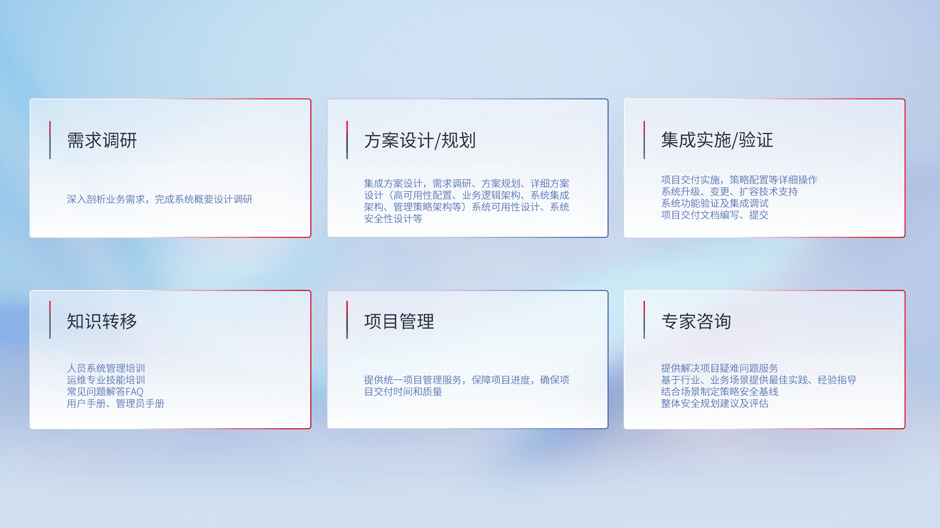 针对客户行业特性,,,,将宏观的安全战略和需求,,,,通过专业的交付服务,,实现项目落地,,,,为客户提供标准规范的集成交付服务。。。。